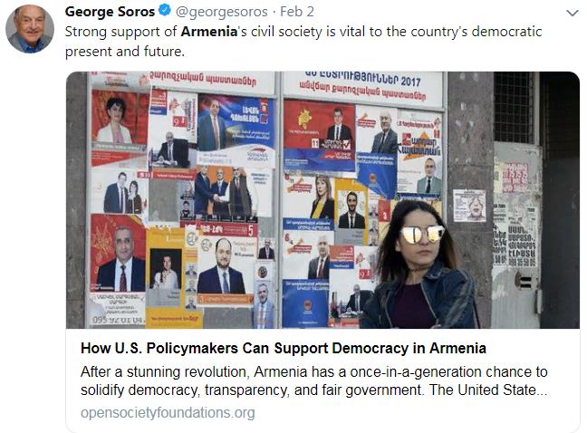 Участие в государственном управлении лиц, связанных с Фондом Сороса, является вызовом не только Армении, но также Армении и ОДКБ, отмечает главный редактор издания Slaq.am Менуа Арутюнян: «Русские говорят: вы назначаете соросовцев на государственные посты, предполагающие причастность к государственным тайнам. Эти тайны касаются и нас, потому что вы входите и в ОДКБ: от этого зависит ваша безопасность, и в ЕАЭС, от которого вы зависите экономически. И если вы назначаете на ответственные посты выкормышей Сороса, вы не задумываетесь над тем, что они будут передавать на Запад информацию, которая касается и нас?»