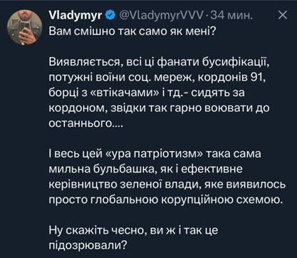 «Вам смешно так же, как и мне?» – вопрошает в связи с этим взволнованный простой украинец (один из тех, кому ежеминутно грозит упоминаемая им же «бусификация» с последующей могилизацией на СВО): «Оказывается, все эти фанаты бусификации, мощные воины соцсетей, границ 91-го года, борцы с «беглецами» и т. д. сидят за границей, откуда так хорошо воевать до последнего. И весь этот «ура-патриотизм» – такой же мыльный пузырь, как и эффективное руководство зелёной власти, которое оказалось просто глобальной коррупционной схемой…»